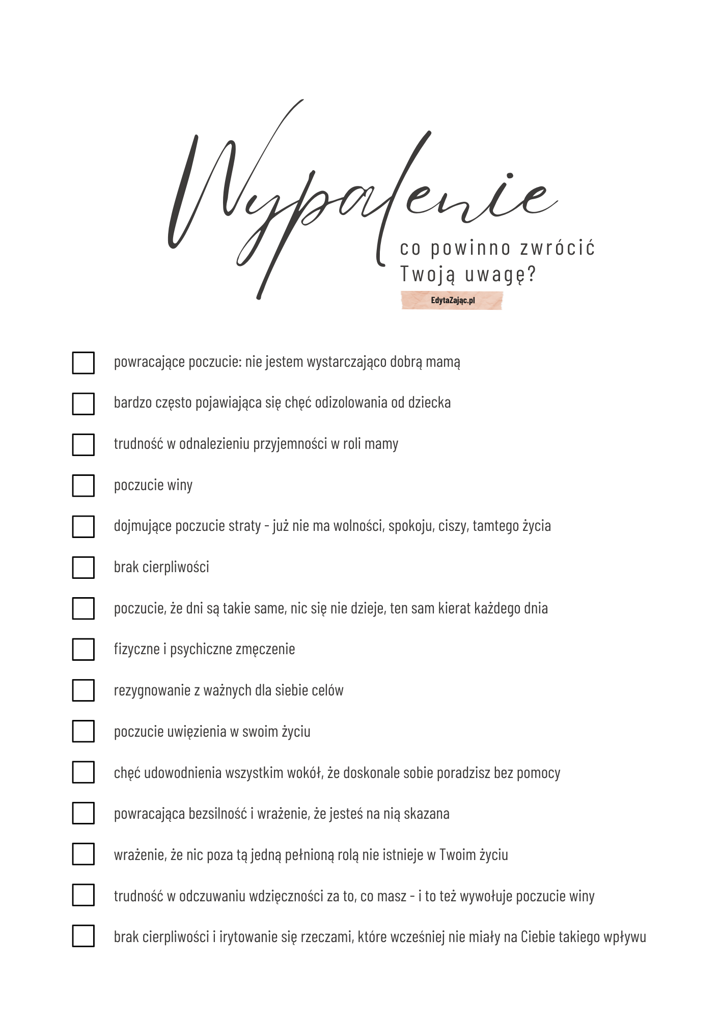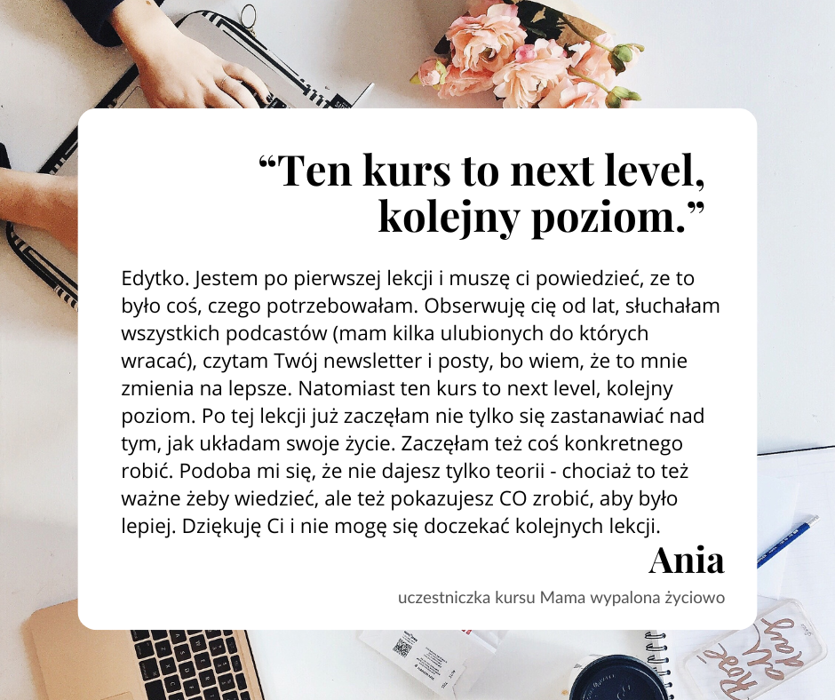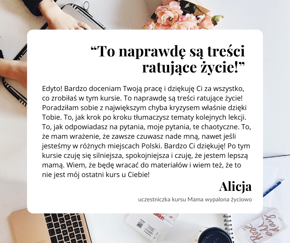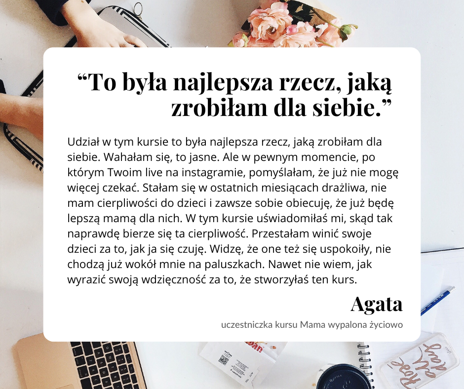 Zależy mi na tym, aby każdy moduł przyniósł Ci konkretne rozwiązania i pomysły na działanie. Jeżeli wypalenie atakuje Cię od czasu do czasu, zacznij pracować nad swoją odpornością psychiczną. Możesz zapobiec powrotom tego nieprzyjemnego stanu. Jeżeli właśnie teraz czujesz, że się wypaliłaś, zacznij działać od razu. Wypalenie życiowe może stać się początkiem wielu trudnych doświadczeń, może też przerodzić się w poważniejszy stan. Jeśli nie czujesz się dobrze w roli mamy, pamiętaj o tym, że nie jesteś skazana na takie emocje. Nie warto czekać, aż wypalenie samo minie. Zadbaj o to, aby to, co dzieje się z Tobą w tej roli, nie kładło się cieniem na to, jak oceniasz całe swoje życie. Poszukaj możliwości na zadbanie o siebie po to, aby Twoje dziecko dostało od Ciebie to, co najlepsze. Wypalenie życiowe sprawia, że każda mama czuje, że nie zdaje egzaminu. Daj sobie szansę na to, aby Twoje macierzyństwo było piękną przygodą.