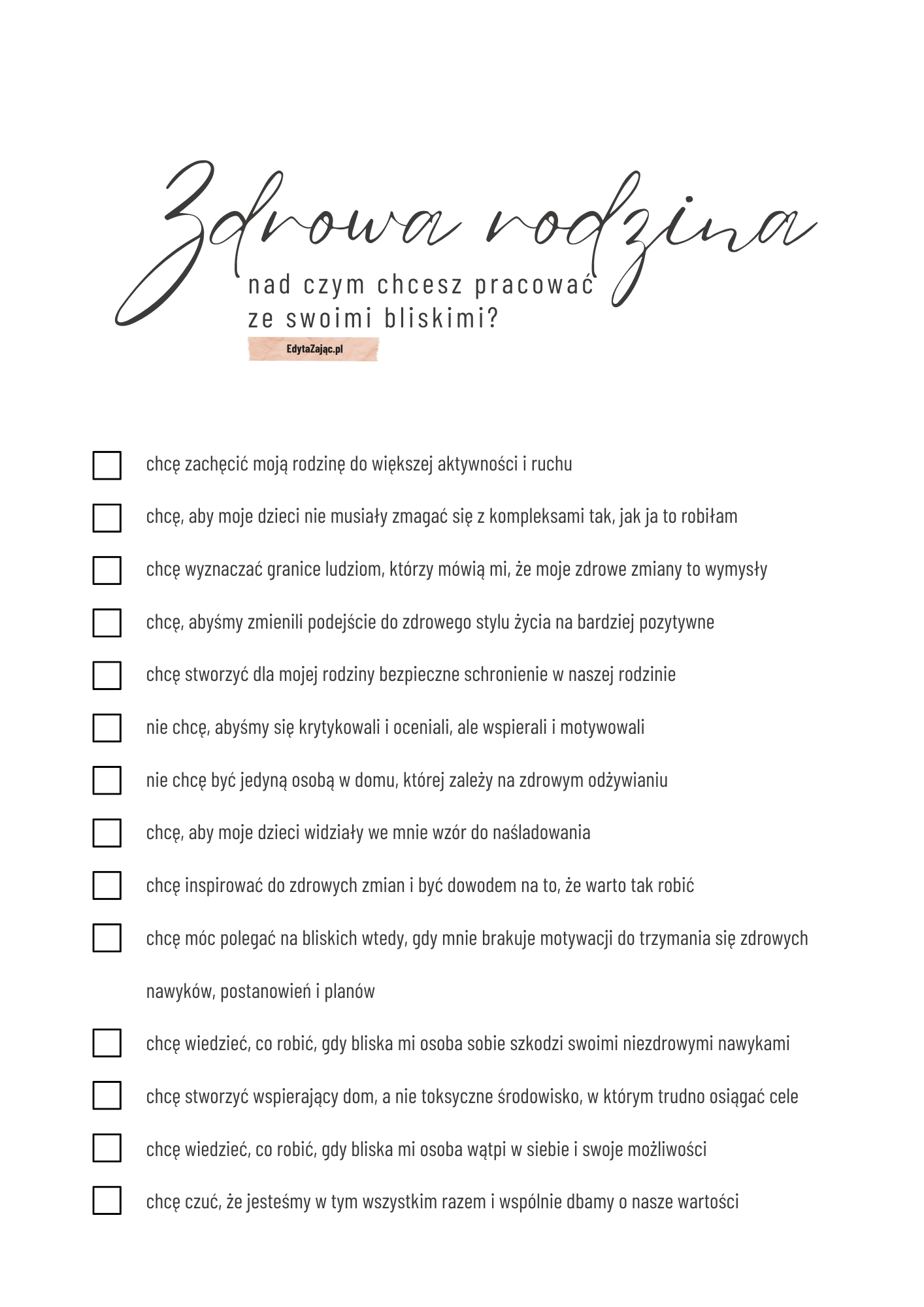 Spójrz na listę, którą przygotowałam i zastanów się nad tym, które jej punkty odpowiadają Twoim celom. Jeśli wiele z nich zaznaczyłaś, to ważny sygnał, że koniecznie trzeba zacząć działać, aby wprowadzać w życie rodzinne zdrowe zmiany. Jeżeli masz na to gotowość, przejrzyj spis treści e-booka Projekt Zdrowie | Rodzina i sprawdź, czy jest tam, coś dla siebie. Jeśli 3-4 tematy lekcji brzmią jak coś dla Ciebie, ten e-book pomoże Ci w dokonywaniu zmian w Twojej rodzinie.